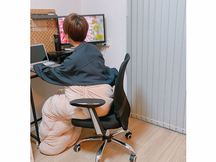 ちょっとおもしろい姿ですが、在宅ワーク中にパソコン作業やオンライン会議をしながらでも、こっそり足元まで温まることができます。