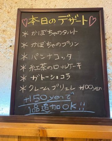 デザートは店内の黒板に書いてあります。この日はこちらの6種類でした。どれも美味しそうなので、悩んでしまいます。