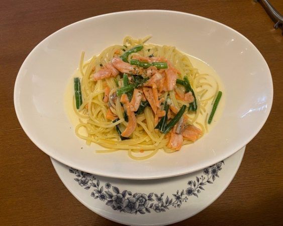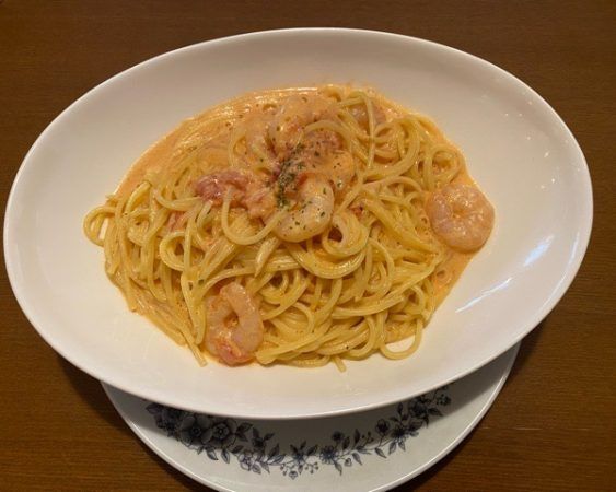 パスタは私がプリプリえびのオーロラソース、えびがたくさん入っていて、ソースは甘めですがさっぱりしていました。友達はサーモンとほうれん草のクリームソースにしました。