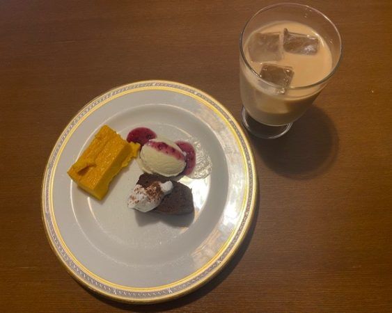 デザートは二人とも悩んだ結果、ガトーショコラとかぼちゃのプリンにしました。飲み物はアイスカフェオレです。