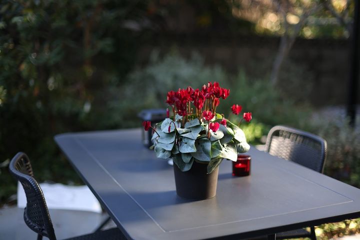 先日のブログでも書いていたように、今年も庭に深紅のシクラメンを置きました。同じ色合いのものでも葉脈の入り方や花の咲き方など様々な佇まいのものがあり、選ぶのにとても迷いました。家に帰って夕暮れ時の庭のテーブルに深紅のシクラメンを置くと、庭全体がパッと華やいで見えて、日が陰るのが早い冬の庭も楽しませてもらえそうです。