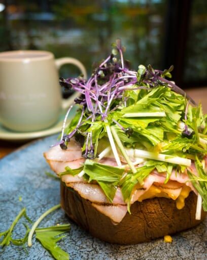 「メープルラウンドのWalk in the park」は、公園の散策をイメージした一品。メープルの甘さが優しい円筒形(ラウンド)の厚切りパンにはスクランブルエッグを忍ばせて、ベーコンや新鮮な野菜をたっぷりとトッピング。ボリュームもあってランチにもおすすめです。トーストの甘さやベーコンの塩味に加え、添えられたマスタードで味変も楽しめます。10時から20時30分(日曜のみ17時30分)までの販売で、コーヒーや紅茶が+¥320になるお得なセットも全日17時30分まで用意します。