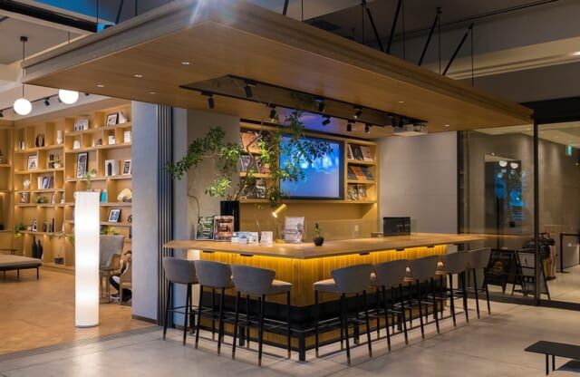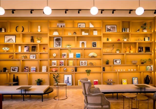 宿泊者やカフェ利用者が自由に利用できる「コミューナルロビー」には大きなテーブルが置かれ、伝統工芸品などが飾られる棚は人気のフォトスポットになっています。