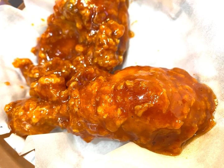 手がベトベトになるのが気になる人はフォークももらえるようですが、筆者らはベトベトになりながら頬張りました。うまい! うまい! うまい! つい煉獄さんのように声に出してしまいます。辛いもの好きの筆者にとってはほどよい辛さで、何よりチキンが肉厚でジューシー。食べ応えがあります。