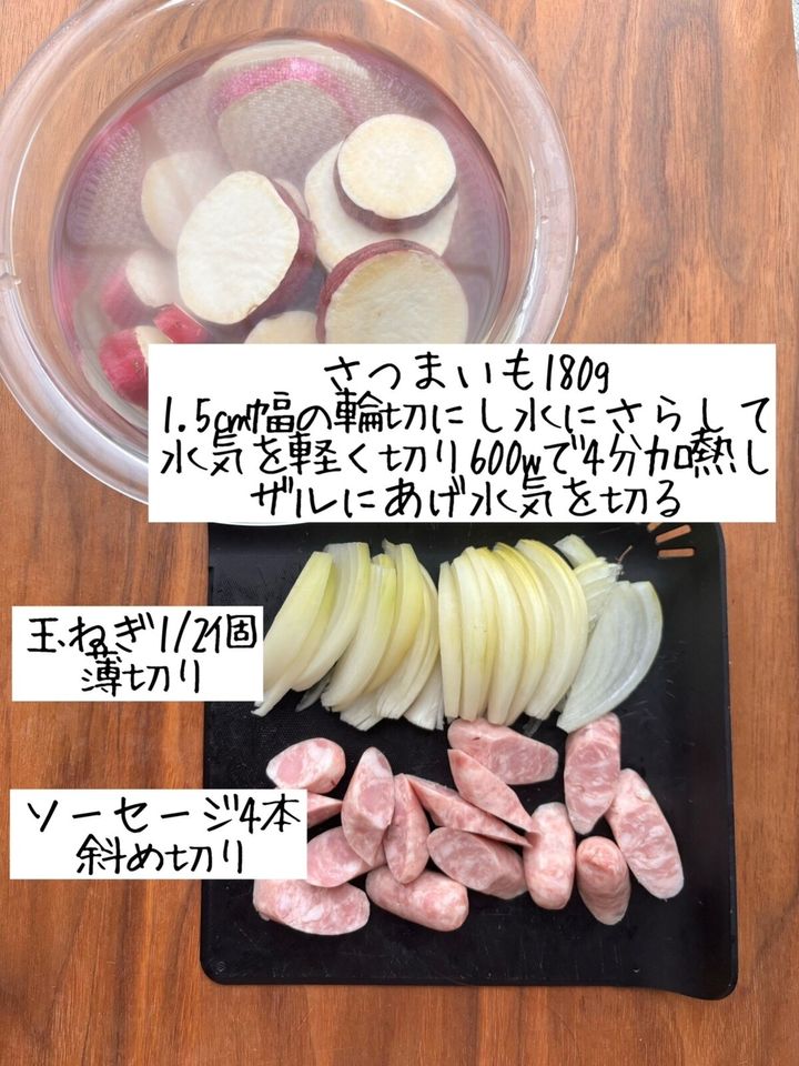 さつまいもは輪切りにし600wのレンジで4分加熱する。玉ねぎは薄切り、ソーセージは斜め切りにする。