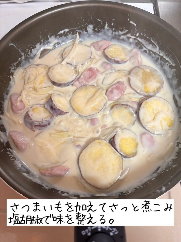 さつまいもを加えてさっと煮こみ塩胡椒で味を整える。