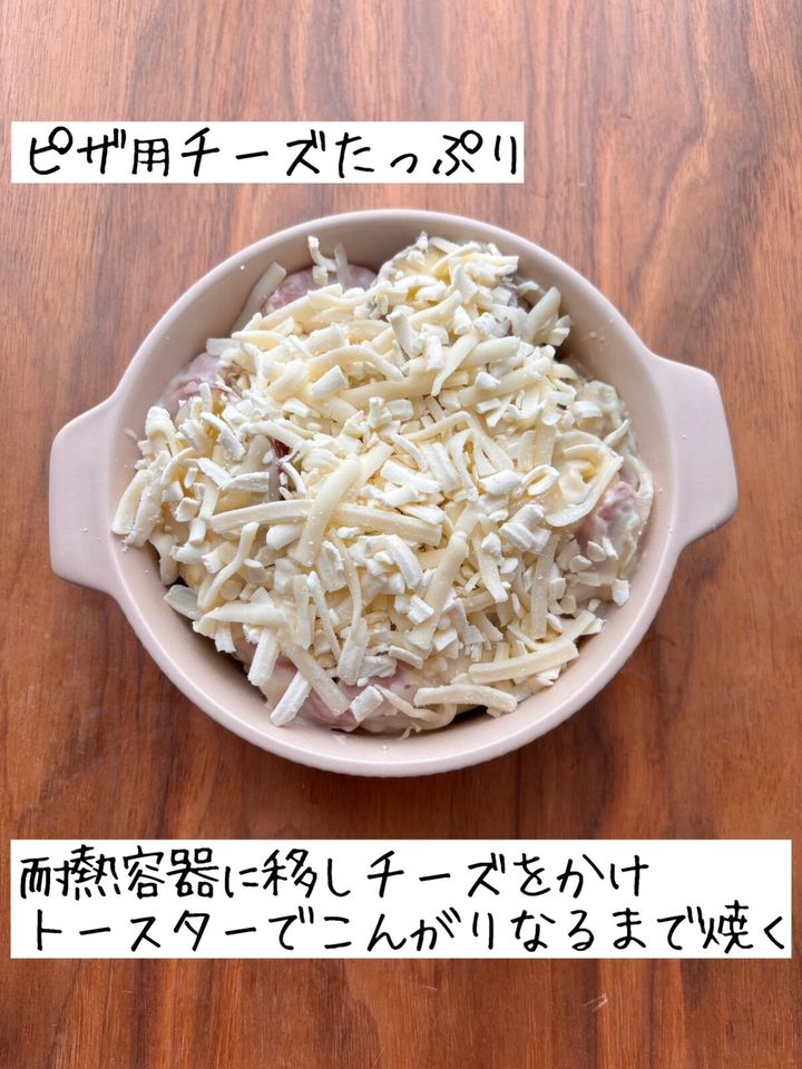 耐熱皿に移し、チーズをかけてトースターでこんがりなるまで焼く。