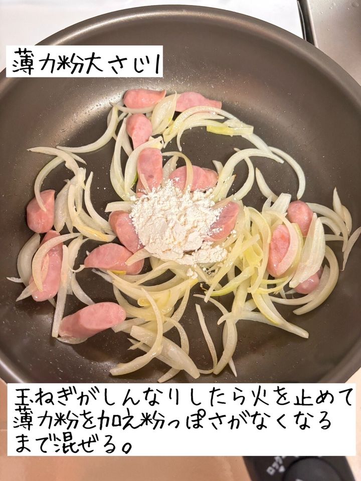 玉ねぎがしんなりしたら火を止めて薄力粉を加え粉っぽさがなくなるまで混ぜる。