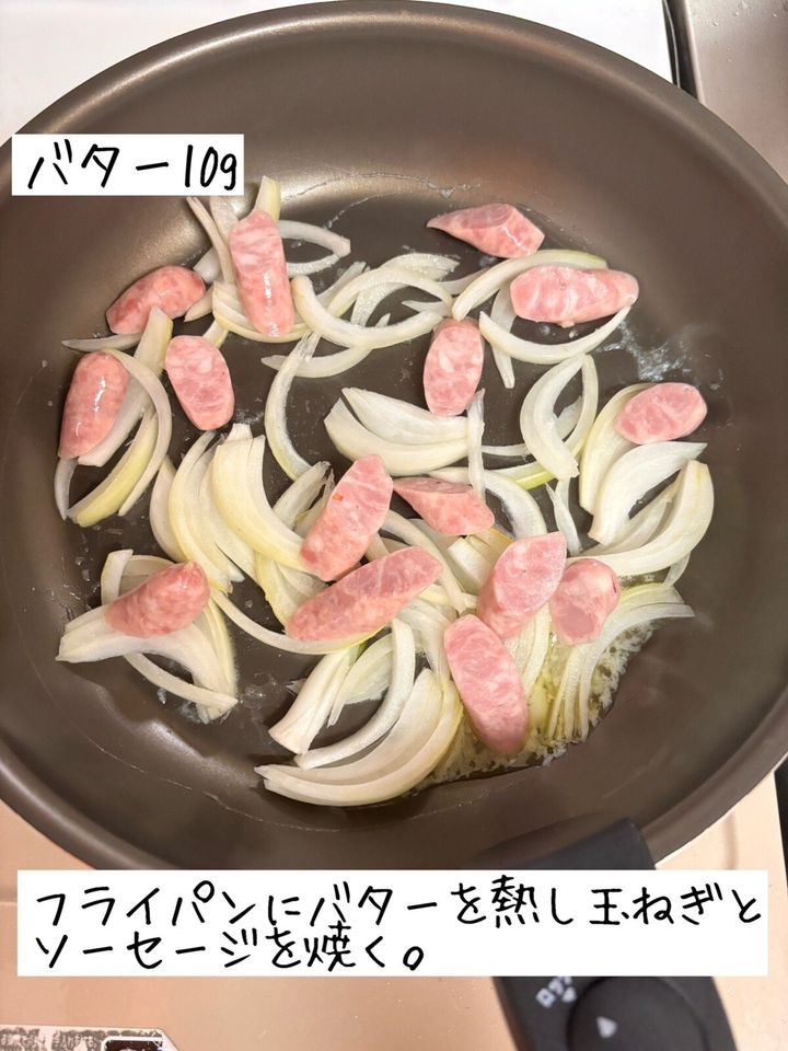 フライパンにバターを中火で熱し、ソーセージと玉ねぎを炒める。