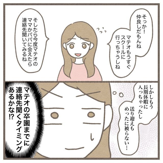 お友達と遊びたいというこーくんの願い、叶えてあげたいのはやまやまですが・・・タイミングが悪すぎますね(汗)長期休暇明けにどうかマテオくんのママかパパに会えますように!