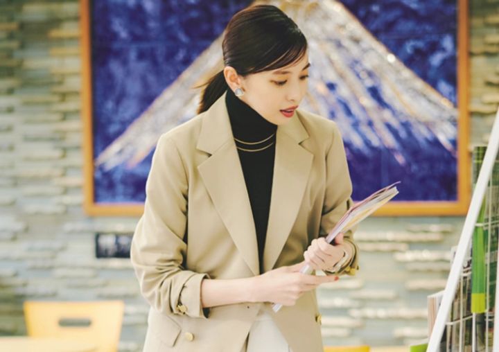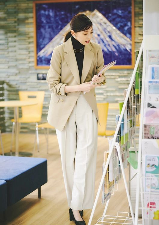 ジャケットと白パンツはスーツ風の着こなしも可能。胸元は黒タートルにチョーカーを足して、仕事できる風のキリリ感をプラス。こんな王道コーデでも垢抜ける秘訣は、ヘアメイクも辛口にまとめること!ウェットなまとめ髪なら、トレンド感も出せて申し分なし。