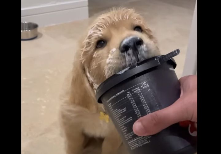 顔がヨーグルトまみれ! 美味しすぎて止まらなくなったゴールデン子犬。