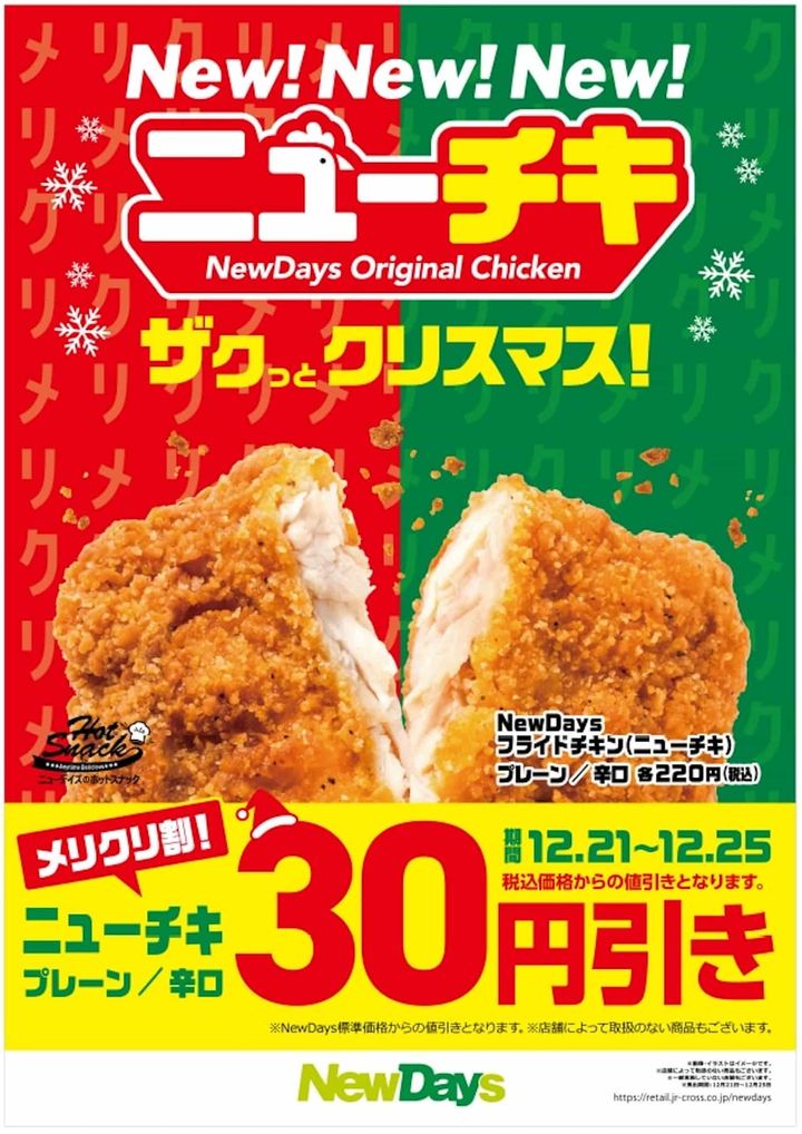 また、クリスマス「ニューチキ」2種(プレーン・辛口)30円引きセールを実施。2023年12月21日(木)〜25日(月)の期間、ニューチキ2種(プレーン・辛口)が30円引きになります(税込み価格からの値引き)。