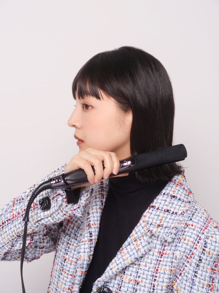 1.ストレートアイロンを140℃の中温で髪全体に軽くスルー。毛先は外にハネるように通します。