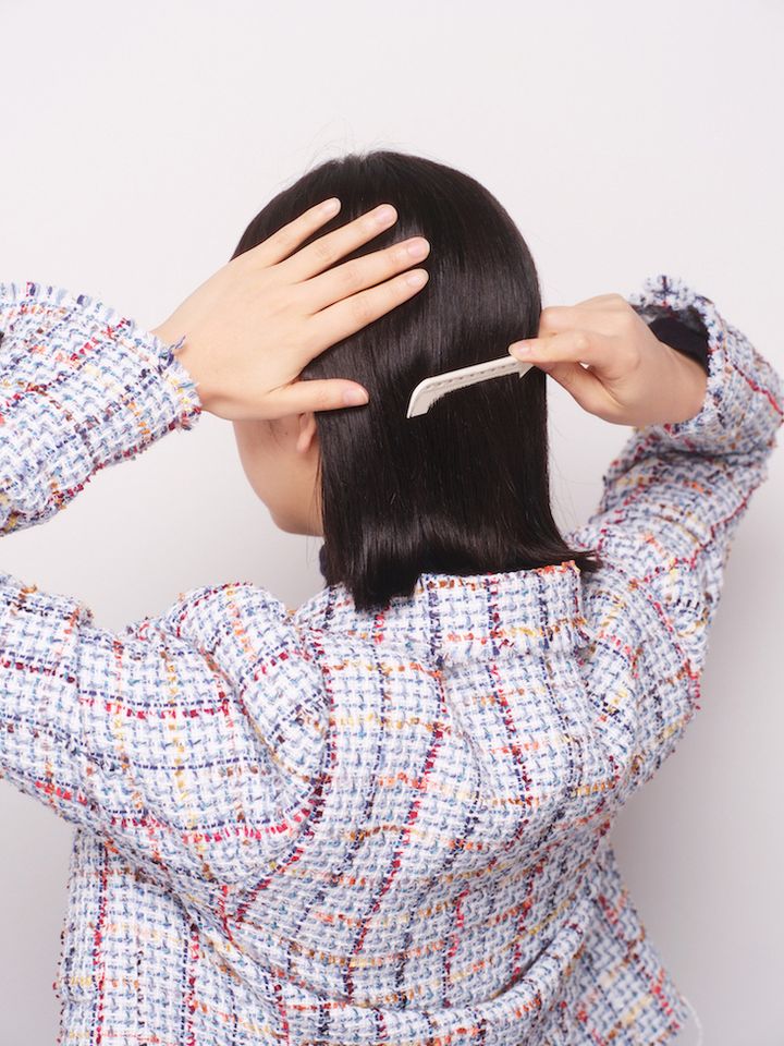 3.目の細かいコームで上から丁寧にトかして。左手で押さえながら、面をピチッと整えるイメージで行います。