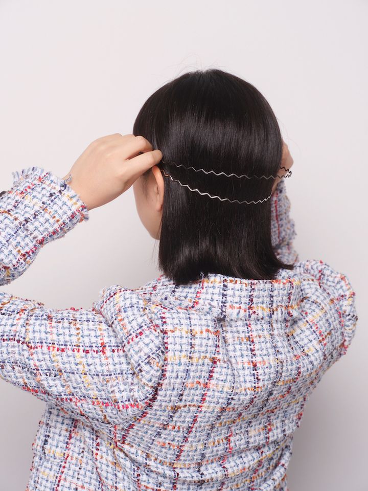 タイト感の秘密は頭の上ではなく後ろに留めるカチューシャの変形使い。シンプルながら目を惹くアクセントにもなります。色味はシンプルなガンメタルとシルバーを2本重ねてクールに。
