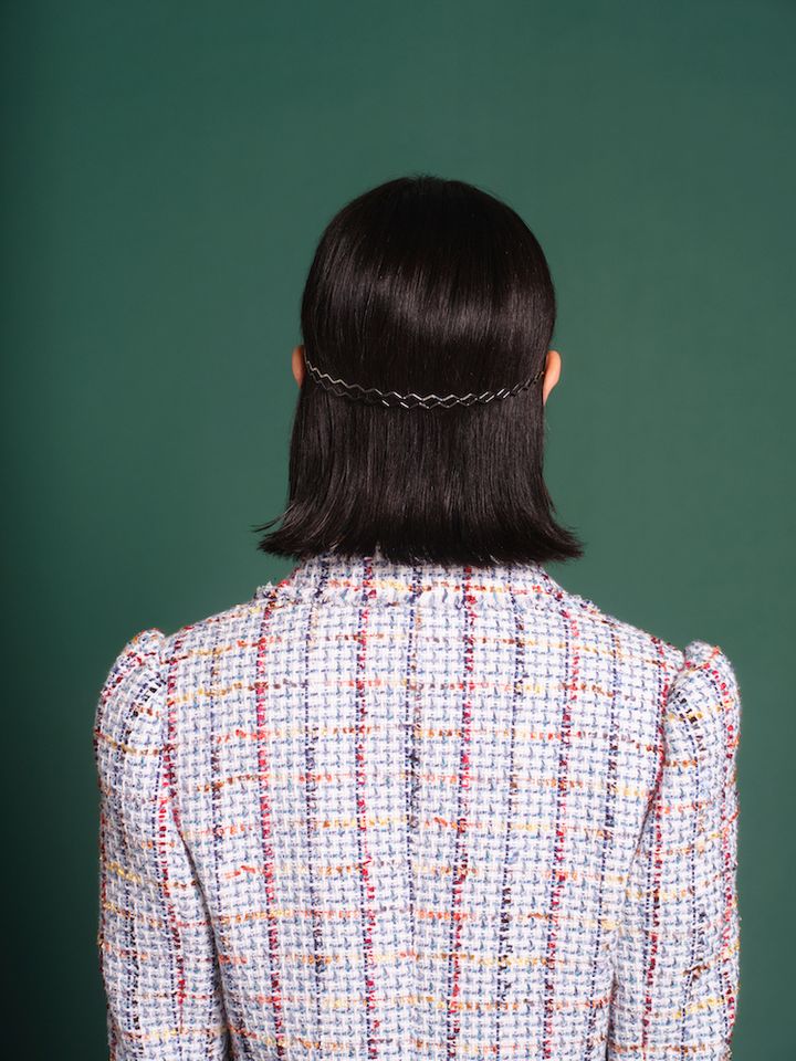 トレンドの華やかなツイードジャケットの装いには、ヘアはタイトに抑えて甘辛ミックススタイルに。カジュアルさとよそいき感と、今らしさのベストなバランスを狙います。前髪をキレイに整え、耳かけしたNOTふわふわなアレンジを、後ろでカチューシャを留めてキープ&アクセントに。