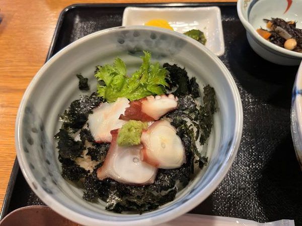セットで頼んだたこ丼。たこのうまみ、歯ごたえもあり、わさび菜・のりがいいアクセントでおいしく完食!