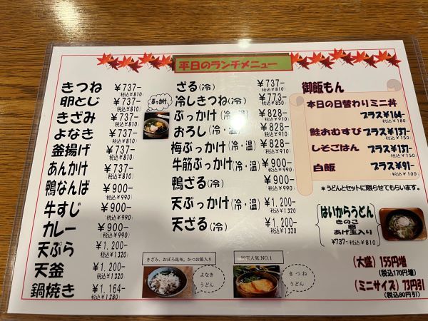 うどんの種類も豊富なランチメニュー