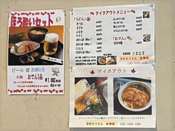 手打ちうどん 紅葉庵 住所:吹田市垂水町3-18-7、チサンマンション第6江坂 TEL:06-6380-1099 営業時間:午前11時30分~午後2時30分(LO2時)、午後5時30分~9時(LO10時20分) 定休日:日曜 駐車場:3台 https://udon-momijian.com/