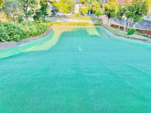 写真では伝わりにくいかもしれませんが、なかなかの急傾斜!初めてすべる時は、大人でもドキドキ!! とっても広いので、家族やお友達と一緒にすべることもできます。また、人工芝なので、季節を問わずに遊ぶことができます。