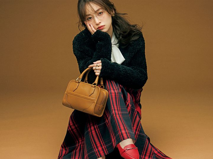 カーディガン¥36,300/グレースコンチネンタル(グレースコンチネンタル 代官山本店) ブラウス¥8,250/RESEXXY スカート¥39,600/ルル・ウィルビー(アルアバイル) 眼鏡¥17,600/ランバン オン ブルー(デリーゴジャパン) イヤリング¥7,560/アビステ リング[人さし指]¥8,800、[中指]¥10,450/ともにココシュニック オンキッチュ(ココシュニック) バッグ¥198,000/J&M デヴィッドソン(J&M デヴィッドソン カスタマーセンター) 靴¥18,700/銀座かねまつ(銀座かねまつ6丁目本店)