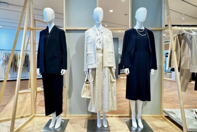 新作のジャケットは、着丈長めのノーカラータイプで今っぽいシルエットが魅力。また、パンツは裾にスリットが施されたストレートシルエットがこなれ感たっぷりです。オールネイビーのセットアップは、クールさもありつつ、どこかやわらかな印象もあって洒落感たっぷり。また、ノーカラータイプのジャケットなら、中に合わせるブラウス次第で印象をグッと変えられるので、幅広い着こなしが楽しめそうです。その他、ツイードジャケットやプリーツが上品なワンピースなどもラインナップしています。