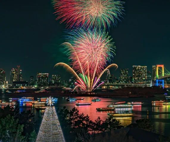 お台場では2023年12月23日(土)の19時00分から「お台場レインボー花火2023」が開催されます。冬は空気が澄みわたり、夜景がひときわ美しく見える季節です。凛とした冬の夜空にダイナミックな華が咲き、クリスマスを意識したイルミネーションがお台場をより幻想的に彩ります。音楽と連動したミュージック花火です。