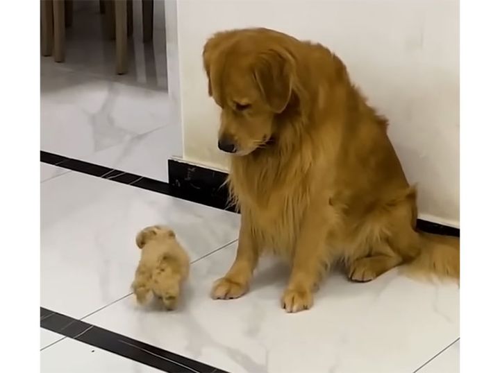 小さすぎてどう接したらいいか分からない! 子犬を見て困っちゃう大型犬。