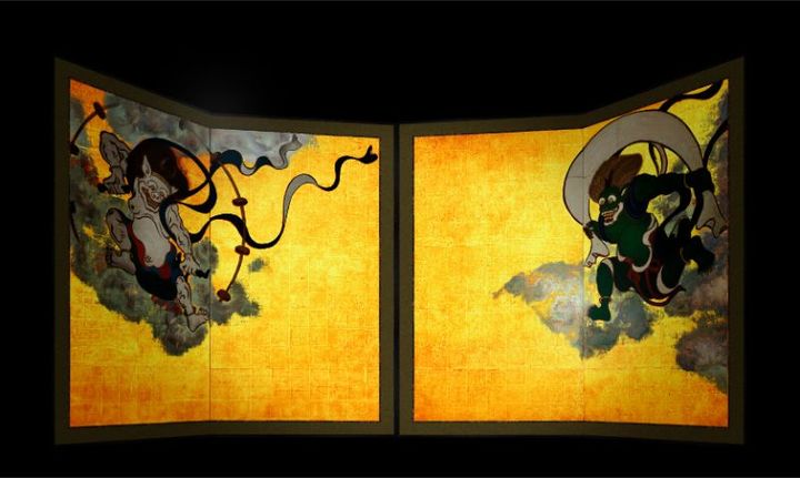 さらに、屏風に仕立てて間近で鑑賞できるようにした上で、昔の日本家屋に差し込んでくる夕陽の光を再現して鑑賞すると、光を反射しない顔料を使った箇所(風神雷神)のシルエットは暗く、一方で背景の金は柔らかく輝きだし、浮遊感が生まれるという。