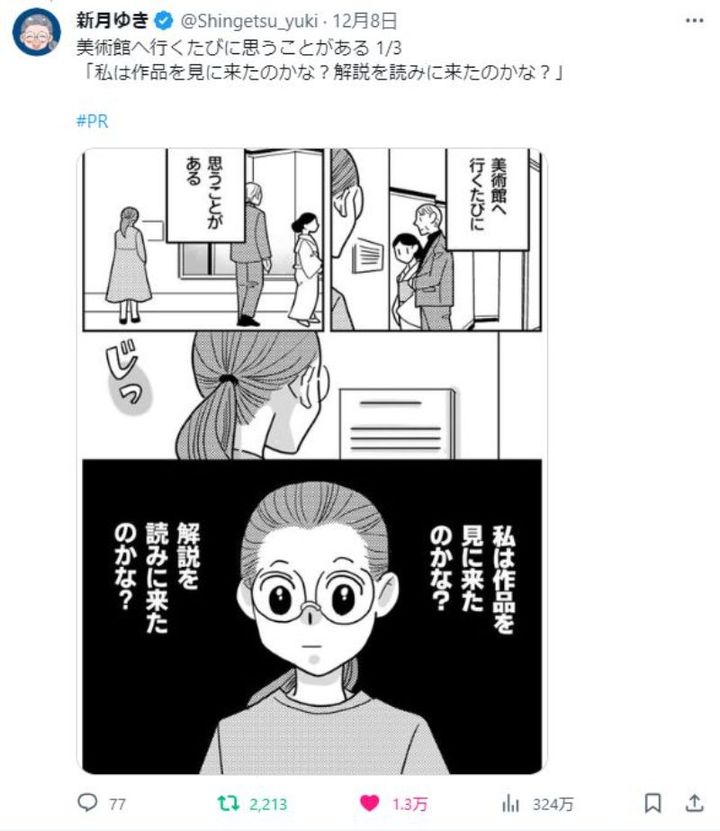 また、本書に掲載されている、漫画家・新月ゆきさんによる体験漫画は、Xで1.3万いいね、2200件以上リポストされ、話題を呼んだ。作家のいとうせいこうさんも絶賛する、新しい美術の見方がわかる1冊だ。