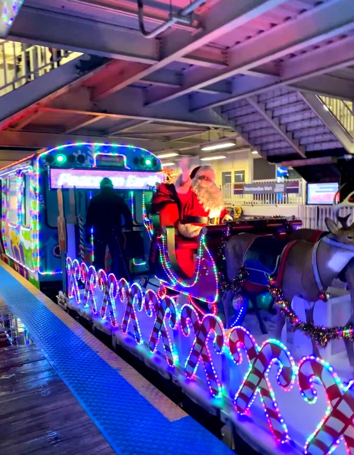 なんと、電車の中央部には立派なソリの上に乗ったサンタクロースが……! 私が乗車した日は体感温度−1℃、かつ雨が降っていたにも関わらず、走る電車の上で手を振り、駅のホームから出発するときには「Ho‼Ho‼Ho‼Happy Holidays!」とマイクパフォーマンスまで。「お願いだから風邪をひかないでね」と心から願いました。