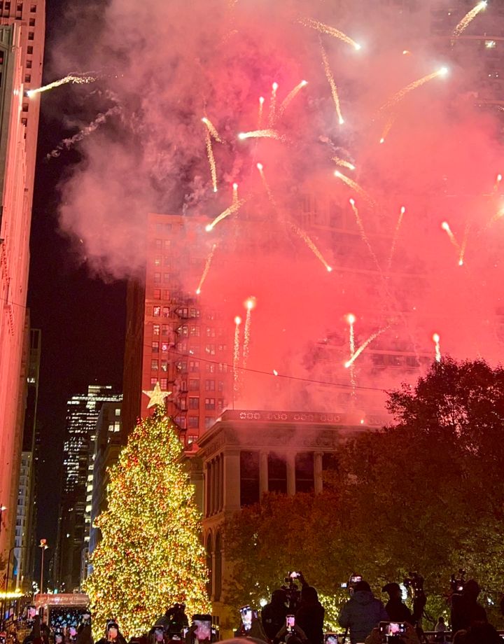シカゴのダウンタウンにあるミレニアムパークの入り口に、大きなクリスマスツリーが登場! 今年で110回目を迎える歴史あるこのクリスマスツリー。点灯式ではホリデーシーズンの幕開けをお祝いするかのように、都会の真ん中にも関わらず花火が打ち上げられ、大勢の人が集まりました。