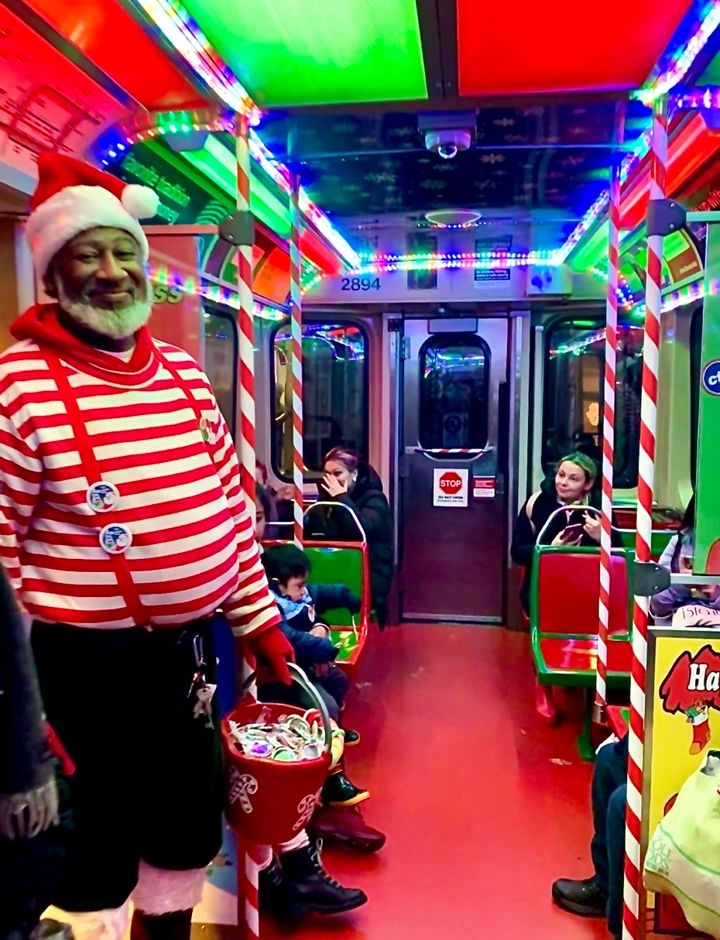 その温かい気持ちは今でも車両に込められていて、外装と内装が可愛く装飾されるだけではなく、車内ではサンタの助手の妖精エルフ(アメリカでは大人気のキャラクター)に扮したCTAの職員が乗客にクリスマスキャンディを配ってくれるのです。ささやかなプレゼントに、みんなにっこりと嬉しそうな笑顔が印象的でした。