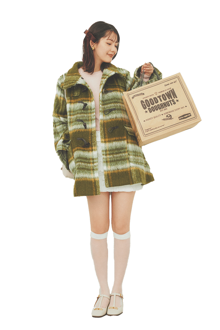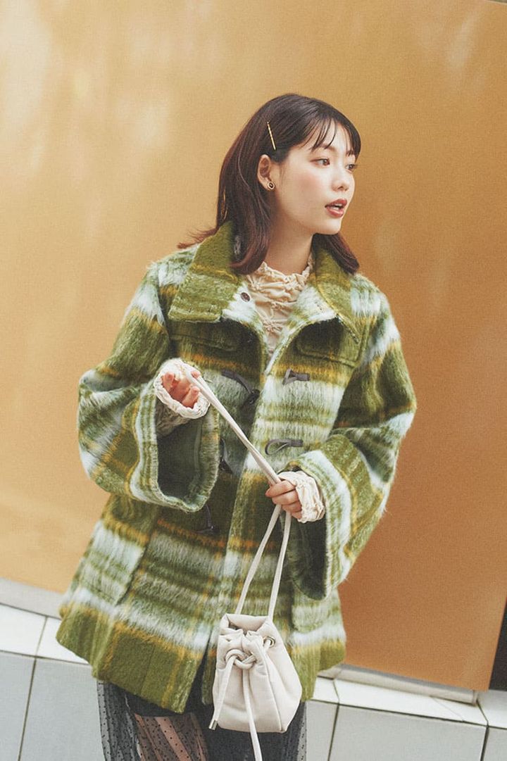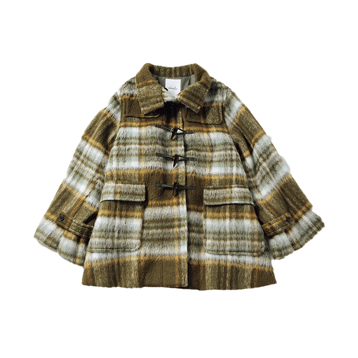 チェック柄で親しみやすさアップ!定番のダッフルコートはお目立ち柄で。両そでのファスナーをあければトレンドのスリットスリーブにもなるよ。