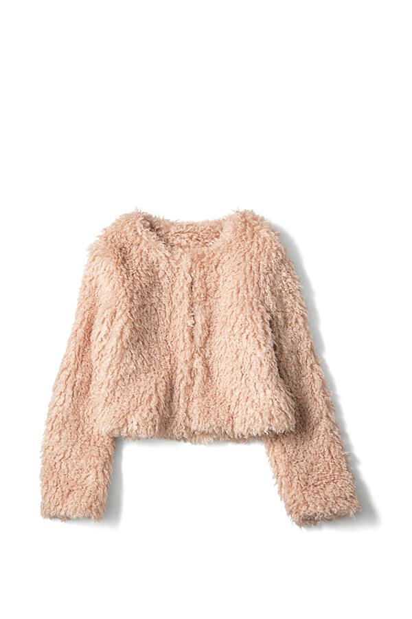 くるくる毛足がレディ度満点。顔まわりの印象もパッと華やぐ♡ すっきりとした短丈シルエットで、スタイルアップも確実!