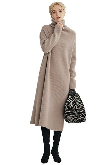 「1枚で女らしく着たいときは体の線を出したほうがうまくいく。たとえば、タートルは面積が広いぶん、ウエストの形がわかるほうがキレイ。ゆったりめのシルエットに抵抗がある人は、首元が開いたタイプなど、首まわりをすっきりさせれば華奢に見えます。肩幅が広めな人は、デコルテの開きを意識することで良いバランスに落ち着くと思います」(渡邉さん)