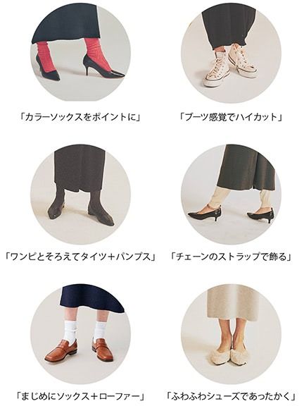 「冬のワンピの足元ってついブーツに頼りがちですが、コーディネートしやすいワンピースを頼りにソックスやタイツと靴の組み合わせを考えて試したり、ちょっと個性的な靴にチャレンジしてみたりと「今っぽさ」は足元で演出。着回しも服を重ねるよりも、足元にバリエーションがある方が今季は新鮮」(渡邉さん)