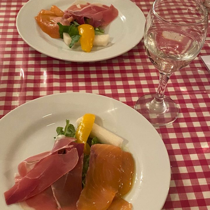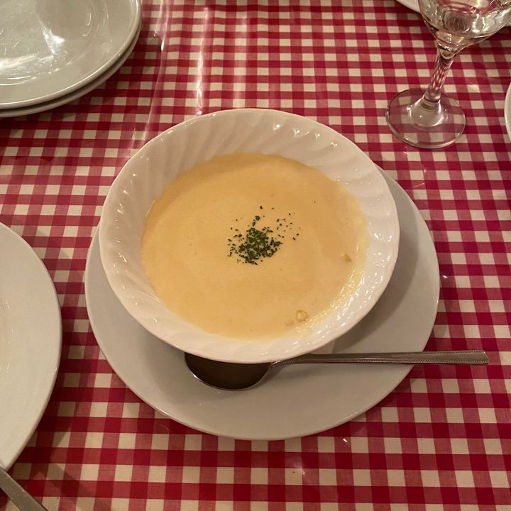 前菜で頂いたのはピクルス、サーモン、生ハムの盛り合わせとバケット、コーンスープです🌽