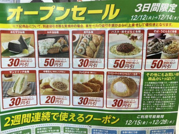 おむすび各種:30円引き お弁当各種:50円引き ファミチキ(骨なし):30円引き スイーツ各種:30円引き 等