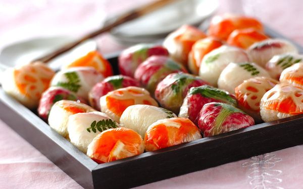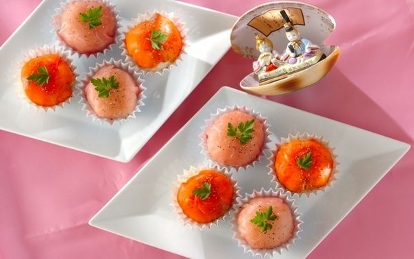 毬(まり)のようにころんとした形がかわいらしい手毬寿司は、ラップで包んで並べると乾燥を防ぐだけでなく、食べやすさもアップ。同じ大きさになるよう、寿司飯を等分に分けておくと良いですよ。鯛やスモークサーモンに野菜を組み合わせ、彩り豊かに仕上げましょう。
