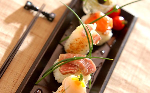握り寿司は難しいですが、俵型に握るお寿司なら初心者さんでも簡単。表面だけをカリッと焼いておき、牛のたたきやお刺身などを彩り良くのせます。お刺身にワインビネガーやしょうゆなどで作ったマリネ液をくぐらせるため、しょうゆなしで食べられますよ。ひと口サイズなので、ワインのおともにも最適です。
