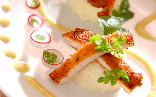 リンゴ酢とサフランで味付けした寿司飯に、カリッと焼いた鶏肉をのせます。レシピでは、鶏肉にレンガをのせて重しにしていますが、フライ返しでギュッと押し付けてもOKです。バターや白ワイン、しょうゆなどで作ったソースをかければ、コース料理のような仕上がりに。