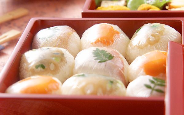 酸味と塩気が特徴の小鯛の笹づけを使った手まり寿司は、お正月のようなおめでたいときに最適です。市販品を使えば簡単に作れるのもポイント。淡いピンク色の鯛が上品で、目でも楽しめますよ。ラップで包み、重箱に詰めると見栄えがします。