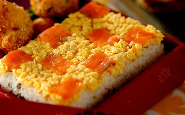 一般的に寿司酢には米酢を使いますが、こちらは代わりにレモン汁を使うアイデアレシピです。レモン独特の香りと酸味でひと味違うお寿司を味わえます。レモンの皮とブラックオリーブも混ぜ込んだ洋風の寿司飯に、炒り卵とスモークサーモンをトッピング。モザイク柄になるように敷き詰めるとおしゃれで、クリスマスにもお正月にも合いますよ。