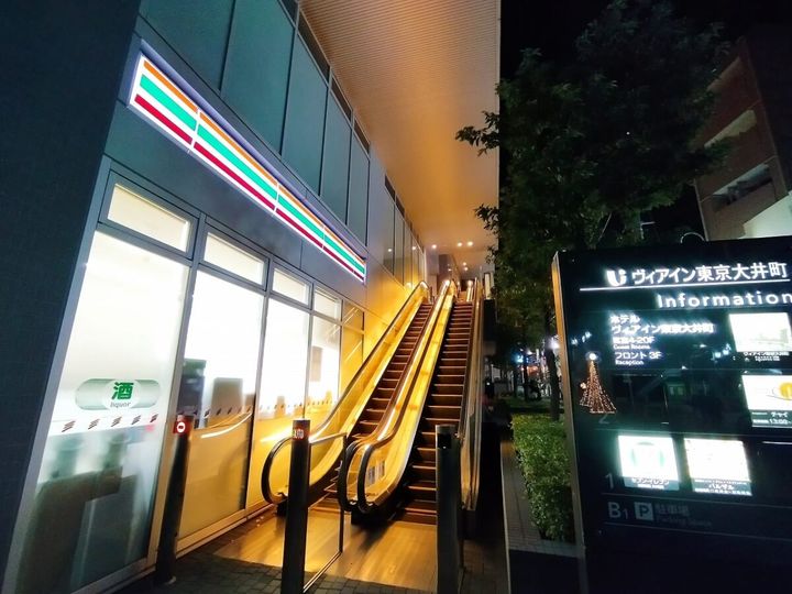 1階にはコンビニエンスストアがあり、買い出しなどに便利。その脇に続く長~いエスカレーターで3階のフロントへ。