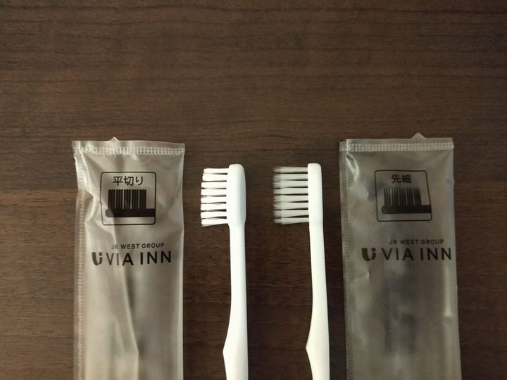 もうひとつビックリしたのは、アメニティバイキングにあった歯ブラシ。よ~く見てください! 左の一般的な平切りの歯ブラシに加え、右側は歯あたりがやわらかく歯間まで届く先細タイプ。こんなところにもホスピタリティを感じます。