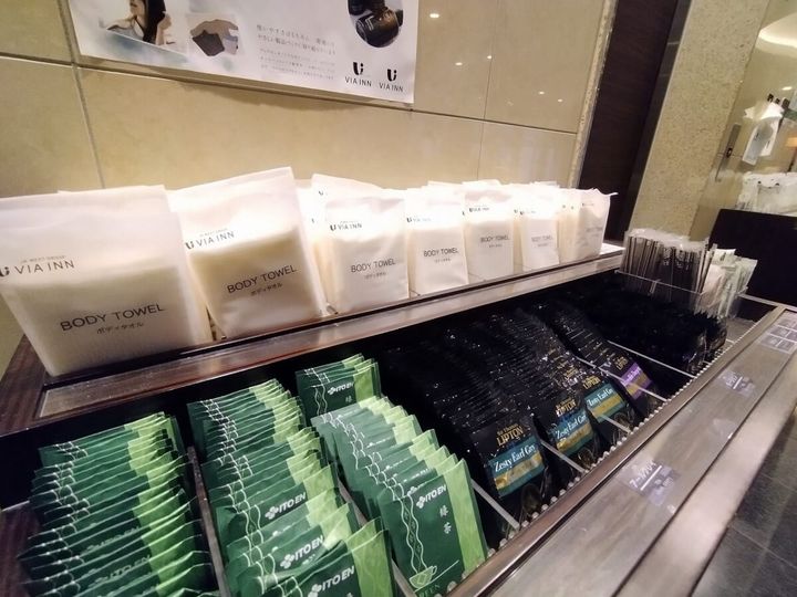 エレベーターホールには、アメニティバイキングを設置。ボディタオル・歯ブラシ・綿棒・緑茶・紅茶などがそろっています。クレンジングや化粧水、乳液などはないので持参すること。ヘアブラシやカミソリは各100円で販売。