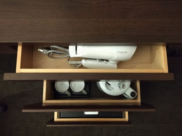 デスク&チェストの引き出しには、ドライヤーやポット、コーヒーカップなどがコンパクトにまとめられ、A4ファイルを置いても広々と使えるデスクでは、パソコン作業なども無理なく行えます。
