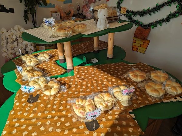 そして「くまさんのおさんぽさんぽ」で推しているパンがちぎりパン。 ちぎりパンはお花のような見た目のかわいいパン。 プレーンからハムなどの惣菜系からチョコなどのスイーツ系とこちらも色んな味がありましたよ~。